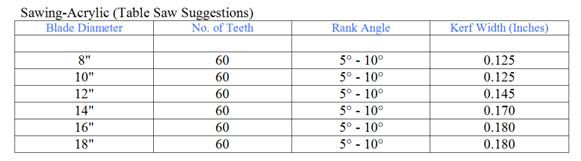 Sawing Tip: Sawing Acrylics is best done with a sixty (60) carbide tipped blade with triple chip grinding; teeth should have a clearance of about 100 - 150° and a positive rake angle of 5 - 10°. These blade angle suggestions should help with the material scrape away rather than chipping, a recommended coolant of water will help produce a smooth wall geometry. Circular saws tend to have a motor speed of around 3450rpm, minimize blade wobble with large diameter hardened steel blade stiffeners. We use cutting boards that slide on the table surface to protect the acrylic from scratching then using a table saw.